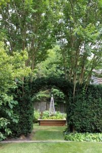 This jewel box garden behind a gate incorporates NJ native plants and non-invasive perennials into a traditional design. Its small footprint is the surprising home to the fifth largest American Elm tree in NJ, along with an array of perennials that attract butterflies and hummingbirds. The garden was designed with family dinners and neighborhood parties in mind. It features a small lawn and gravel driveway, surrounded by trees, flowering shrubs, and perennials. The lawn area in the front yard was dramatically reduced by the addition of several large planting beds. The garden constantly evolves over the season, making it an ever evolving source of joy!